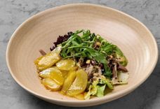 170 г • Микс салата, язык отварной, груша, мед, масло сливочное, кунжут, кедровый орех, руккола, бальзамический соус, ореховый соус, соевый соус, сок лимона