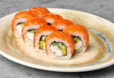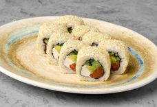 250 г • рис, нори, сыр кремчиз, огурец, авокадо, семга, креветки, имбирь маринованный, кляр, соус терияки,кунжут