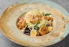 230 г • Креветки тигровые, салатный микс, сыр выдержанный твердый, черри, яйцо перепелиное, хлебные чипсы, заправка Цезарь